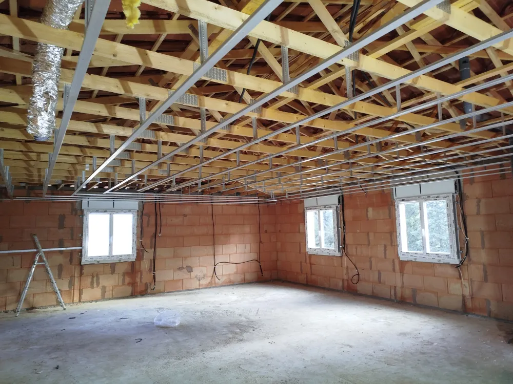votre peintre en bâtiment à à été appelé pour une maison neuve. pendant son intervention, votre professionnel a procédé a la pose d'ossature métallique du plafond.